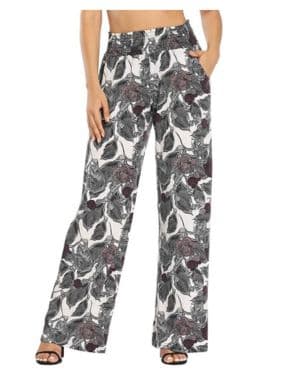 - Look elegante y sofisticado: Combina unos pantalones con flores en tonos suaves con una blusa de seda en un color sólido que complemente el estampado. Completa el conjunto con unos tacones altos y accesorios delicados como unos pendientes de perlas o pulseras finas.